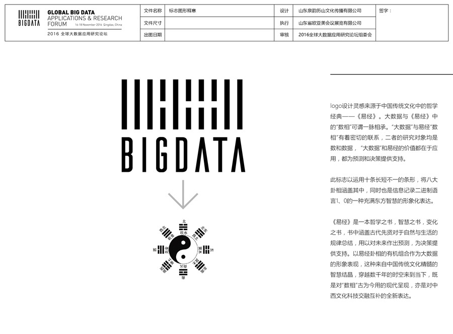 Big data is to analyze and predict the future based on mass data. It is similar to the Book of Changes in traditional Chinese culture. Like 0 and 1 in the world of Internet, yin and yang are basic elements composing various things with combined transformation. Therefore, we have put the Eight Diagrams in the Book of Changesinto symbol design to represent data changes in the Internet.